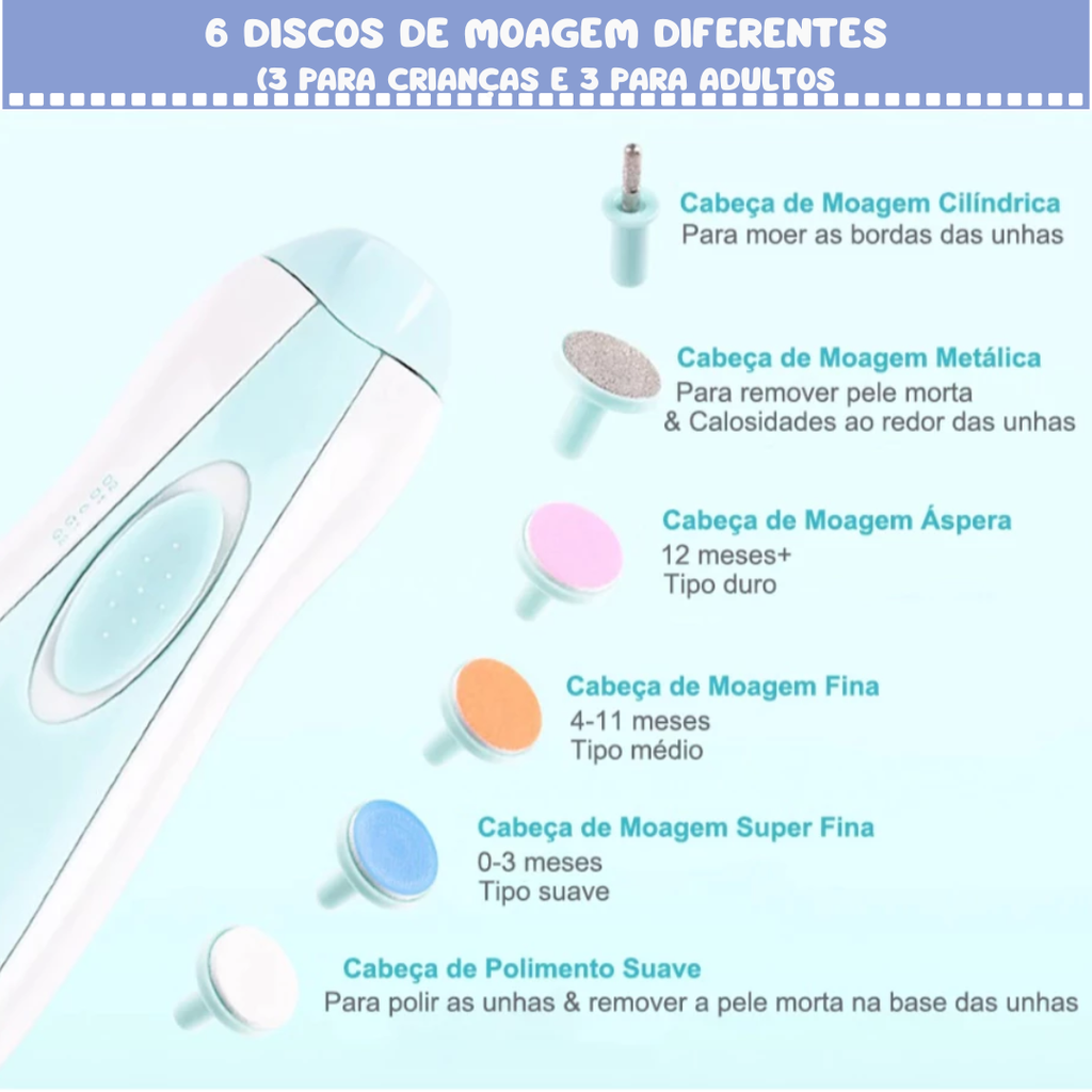 Com seis lixas intercambiáveis, o aparador se adapta perfeitamente a cada fase — desde as unhas delicadas dos bebês até as mais firmes dos adultos. Cada lixa foi desenvolvida para oferecer o equilíbrio ideal entre suavidade e eficiência, garantindo um cuidado seguro e preciso.