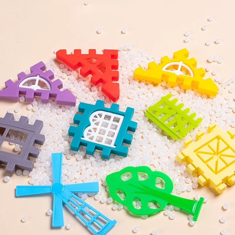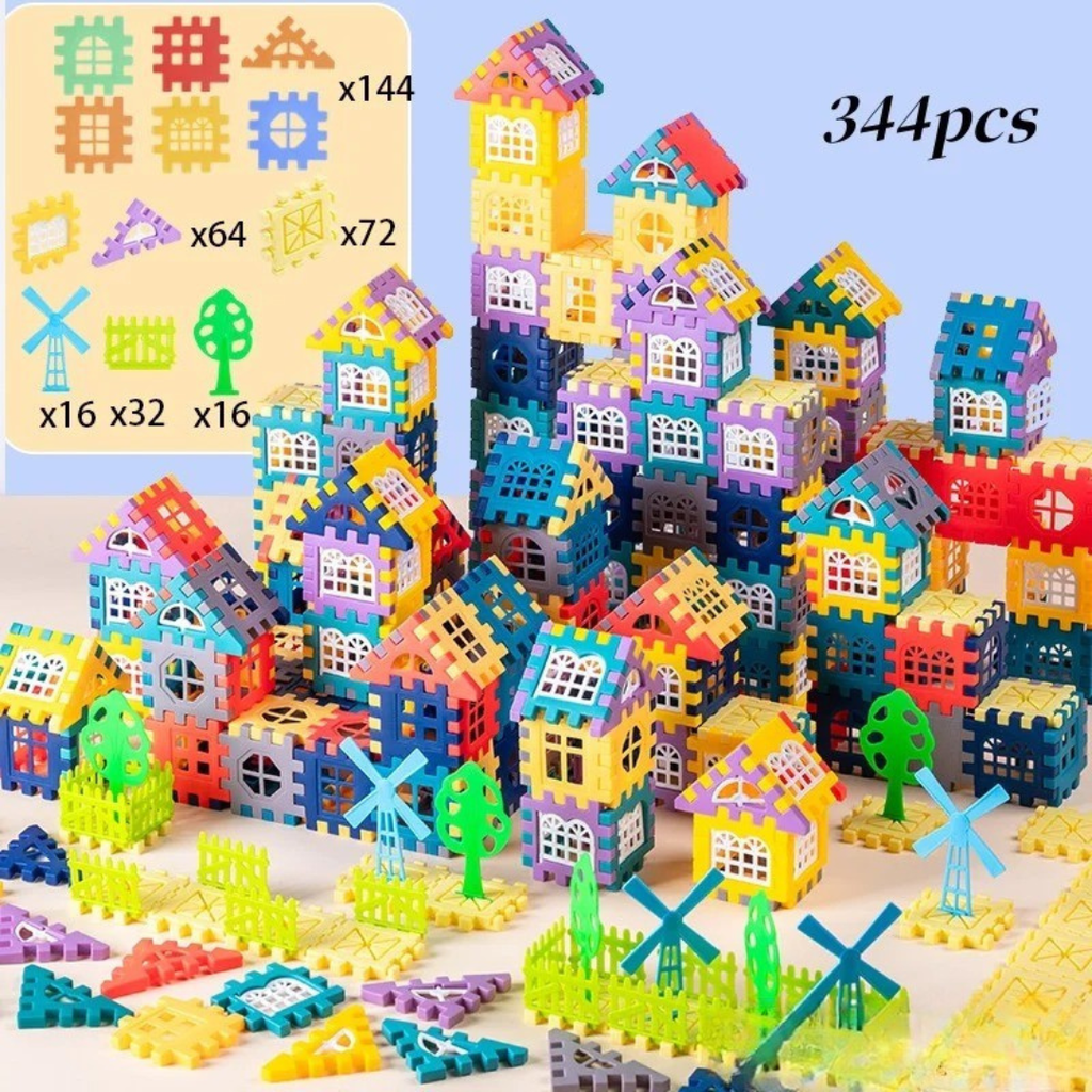 - Peças coloridas com janelas, telhados e formatos variados